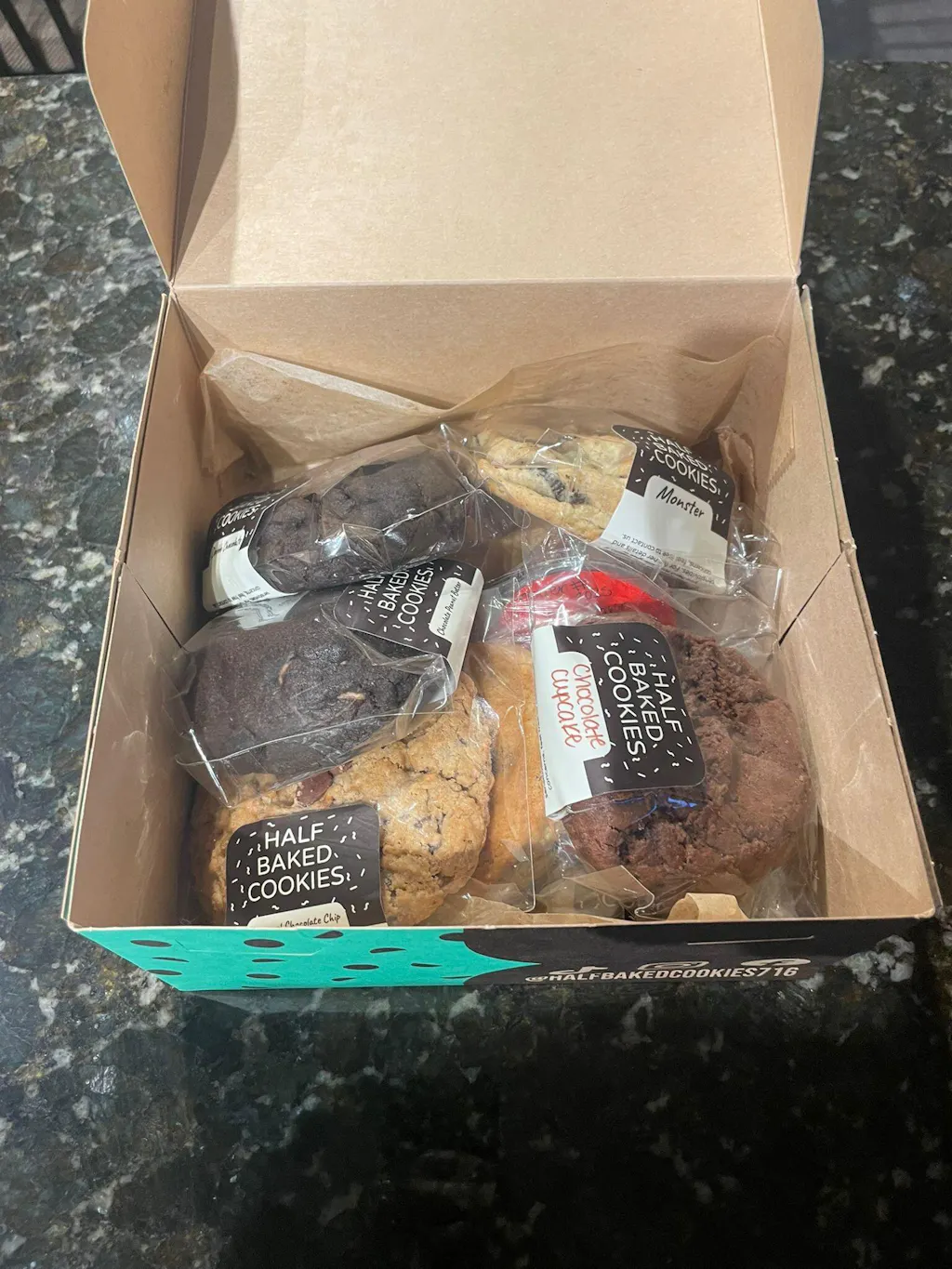 Flavors: Chocolate Chip, Double Chocolate, Oatmeal Chocolate Chip, Chocolate PB, Monster, Sea Salt Caramel, 2 different Rotating Chocolate Specialty Cookies of the Week